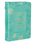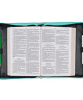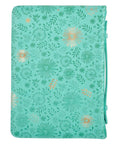 Calm an anxious heart with this simply charming Be Still and Know Turquoise Faux Leather Fashion Bible Cover. Protect your Bible, carry notes securely, and relax in the knowledge that God is sovereign. This Bible cover is packed with features that make it a necessity for a woman of any age that carries a Bible to church, Bible study, or anywhere on the go. Heat debossed and gold foiled flowers cover the surface of the back, spine, and front panel of this turquoise faux leather Bible cover. A framed text block in a mock applique style in the center of the front panel holds a heat debossed verse from Scripture that is partially gold foiled.