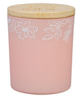 The pink glass jar features a white floral border around the rim and a white hand-lettered text in the center.