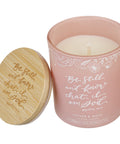 A tightfitting bamboo lid that preserves the fragrance is laser-engraved with the same Scripture verse. The candle is made from 100% soy wax and infused with an 8% vetiver and moss fragrance. Vetiver is a calming and soothing scent with grounding effects often used to reduce stress, anxiety, or tension. It can also promote better sleep, and it pairs perfectly with the earthy smell of moss. The jar can be repurposed once the candle has burnt out. The candle has a 22-hour burn rate, is cruelty-free, and has no parabens or phthalates.