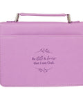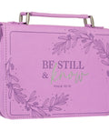 Set your intention for your daily Bible study when you read the calming sentiment of the Be Still & Know Purple Laurel Faux Leather Fashion Bible Cover and breathe in the tranquility and peace it brings.