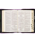 Silver hardware attaches a lay-flat handle and matches the silver foil on the front cover. The silver metal zipper pull is engraved with the word GRACE and easily closes the purple zipper. A slip pocket on the back panel is handy for storing loose notes and bulletins and features the entire verse that is heat-debossed in a multi-font design accented with heat-debossed laurel leaves.