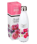 The durable double-walled durable stainless steel water bottle won't break when it is dropped and the 17 fl. oz. capacity allows ample room for icy cold or comforting warm drinks. Do your part for the environment and stop using those single-use plastic water bottles. This greener option is more cost-effective in the long run. The water bottle is presented in a coordinating full-color printed gift box that turns an everyday bottle into an instant gift.The Be Still & Know White Floral Stainless Steel Water Bottle is a thoughtful way to support a friend going through a tough time, but the message is general and positive enough to give as a birthday gift to a mom or a sister. The durable Be Still & Know White Floral Stainless Steel Water Bottle will be appreciated for years to come.- White Bottle with Floral Design