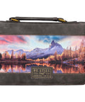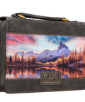 Two lightly texturized charcoal gray faux leather panels cover the back, front, and spine of the Bible case. A tranquil full-color landscape depicting a calm river flowing through a valley surrounded by majestic mountains is printed and inlaid on the front cover. A small appliquéd charcoal gray faux leather patch is centered at the image's base, and is heat-debossed and gold foiled with the sentiment.