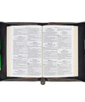 Antiqued brass hardware attaches the lay-flat handle to the body securely, and a charcoal faux leather zipper pull smoothly zips the cover closed. Topstitching adds to the quality of the cover, which is already constructed to be very durable. Keep your church bulletin, notes, or verse cards safe within the exterior slip pocket on the back panel, and keep two pens tucked into the interior pen loops for taking notes.