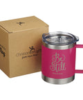 - Pink powder-coated mug with laser engraved text