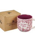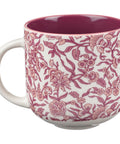 The pink floral design on the exterior transitions into a glossy, deep plum raisin interior. The mug's generous size is ideal for those who enjoy a rich latte or a creamy hot chocolate, and its design – with straight edges, a broad mouth, and a gently rounded base – marries form with function. The c-shaped handle comfortably accommodates three fingers, ensuring a secure grip. The mug is microwave-safe, perfect for when you crave a quick mug cake, though hand-washing is recommended to maintain its appearance. It also comes packaged in an attractive tuck-top gift box, ready to wrap as a gift.