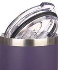 Two silver metal bands, one at the top and another at the bottom of the stainless steel mug, frame the mug's purple powder-coated finish. The sentiment is laser-engraved in an informal flowing script.