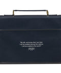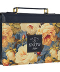The gorgeous printed front panel of the Bible case is attached to a deep royal blue faux leather panel that clads the spine and continues onto the back. Here, you will find a slip pocket that is useful for storing loose notes. The slip pocket is decorated with the white-lettered Scripture verse referenced on the front.