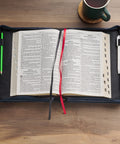 Never be without a pen or pencil to take notes when you store them in the two elastic pen loops inside the Bible case. A second notable feature on the interior is the red and black ribbon markers that are attached to the spine. The red ribbon marker is traditionally used to mark passages from the New Testament, while the black marker is used for the Old Testament.