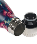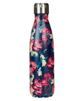 The stainless steel water bottle is covered with a pink and cream floral design set against a midnight blue background. The silver laser engraved sentiment is held by a midnight blue medallion outlined in pink.