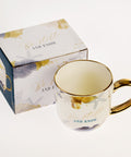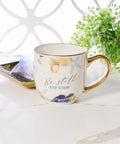 The soft outlines of shells, starfish, and seaweed are accented with large swirling blobs of deep blue and gold on the front and back of the ceramic mug. The multi-colored and multi-font sentiment is placed on the front of the mug in the center of the design. It appears in blue and gold-foiled lettering.