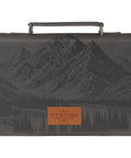The charcoal gray faux leather cover features a detailed heat-debossed mountain landscape across the front—rugged peaks and tall pines. A tan faux leather patch in the center highlights the Scripture in bold, simple font.