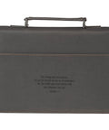 The Be Strong and Courageous Charcoal Gray Faux Leather Classic Bible Cover is made for adventurous men who face life with faith and courage.
