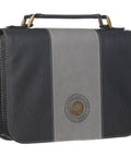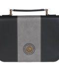 The faux leather Bible cover features a two-tone black and gray blocked design with black outer panels flanking a smooth gray panel on the front cover. At the base of the gray panel, an antique brass metal medallion that is stamped with a regal lion visage is adhered to the center of a heat-debossed circular frame that features the heat-debossed sentiment in capital letters.