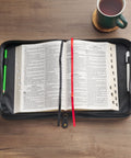 Gray topstitching along the edges of the slip pocket and the seams of the Bible cover ensures a durable product that will last for years. A black faux leather handle is attached to the spine with antique bronze metal handle hardware. This handle conveniently folds completely flat so that your Bible opens all the way when you open it inside the cover. The Bible cover is equipped with two ribbon markers that are attached to the spine –a red one to mark the New Testament and a black one to mark the Old Testament. To ensure you always have a pen handy, two elastic pen loops are attached to the interior. All these features plus your Bile will be kept safe when you close the cover with the black zipper and its cross-engraved antique bronze metal zipper pull.