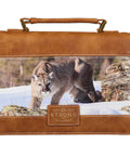 Cover your Bible in the Be Strong and Courageous Mountain Lion Toffee Brown Faux Leather Classic Bible Cover, and be filled with a sense of confidence as you open it to study the Word. This gorgeous Bible case will be your daily call to faith.