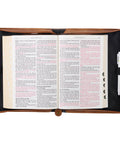 Toffee brown faux leather panels line the edge, spine, and back of this Bible cover and are edged by topstitching. Durable antiqued brass metal hardware on the lay-flat handle and the zipper pull, lends sturdiness to the design. An exterior slip pocket on the back panel sits ready for you to fill with a bulletin, notepad, or even prayer cards, and two interior pen loops allow you to keep your writing supplies close.