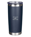 The sentiment is laser-engraved on the navy blue exterior of the stainless steel mug.