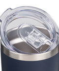 Two silver stainless steel bands frame the top and bottom of the double-walled travel mug. The double insulation ensures your drink stays warm or cold for 24 hours and eliminates condensation from forming on the exterior, leaving no marks on table surfaces. The travel tumbler is outfitted with a clear plastic lid with a silicone seal that fits snuggly into its mouth. The lid has a retractable sip hole cover with a raised edge to prevent spills or leaks. The stainless steel travel mug has an 18-ounce capacity, which equals two and a half standard cups—plenty of coffee, tea, or water to keep you hydrated.