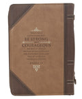 Abundant with texture and detail, the Be Strong and Courageous Walnut-Brown and Tan Faux Leather Classic Bible Cover has the look and feel of an antique book and is the perfect Bible cover to protect your dad's valuable Bible.
