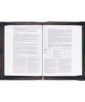 The faux leather Bible cover features a zipper with a cross-engraved metal zipper-pull, a convenient faux leather lay-flat spine handle, and 2 pen loops inside.