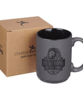 The mug features a glossy black interior that elegantly spills over into the rim, creating a striking contrast with the matte gray exterior. A large C-shaped handle extends from the side, comfortably accommodating four fingers. This cylindrical mug holds 14 fluid ounces and is dishwasher-safe. It comes neatly packaged in a brown tuck-top gift box.