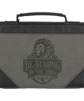 The Be Strong in the LORD Black and Gray Lion Faux Leather Classic Bible Cover is part of the Strong in the LORD Black and Gray Lion Collection. This collection includes a stainless steel tumbler with a reusable straw, a metal keychain, a ceramic mug, a stainless steel travel tumbler, a faux leather Bible cover, a reusable non-woven shopping tote bag, and a faux leather journal.