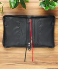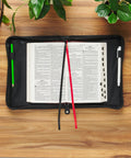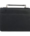 A black zipper, adorned with a silver metal cross-engraved zipper pull, securely closes the Bible case on three sides. The matching silver handle hardware, designed to fold completely flat, ensures the spine of your Bible is protected when it's open. For added convenience, a slip pocket on the back panel provides ample space for notes and bulletins. Inside, two pen loops keep your pens, pencils, or highlighters neatly organized and readily accessible, ensuring you're always ready for note-taking or study.