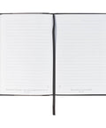 A lightly textured black faux leather panel wraps around the spine and covers the back of the journal. It is attached to a gray faux leather front panel, which in turn connects to two black faux leather corners with double topstitching for a classic quarter-bound look. A striking lion's visage on the gray front panel crowns an embossed typographical design that features the sentiment.