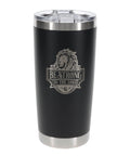 A sleek silver lion's face is laser-engraved above a typographical design on the front of this matte black stainless steel mug.