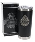 The Be Strong in the LORD Black Stainless Steel Mug is part of the Strong in the LORD Black and Gray Lion Collection. This collection includes a stainless steel tumbler with a reusable straw, a metal keychain, a ceramic mug, a stainless steel travel tumbler, a faux leather Bible cover, a reusable non-woven shopping tote bag, and a faux leather journal.