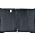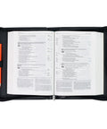 A black lay-flat handle is attached to the spine. A silver cross engraved zipper-pull makes closing the Bible cover easy and two pen loops inside keep writing instruments handy.