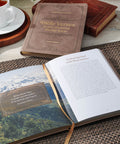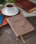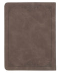 This soft brown faux leather devotional has a simple, elegant suede cover and beautiful, gold gilt-edged pages. A decorative, heat-debossed frame fills the border, and the gold-foiled title is front and center. A matching gold ribbon marker is useful for keeping your place in the book as you commit God's Word to memory.