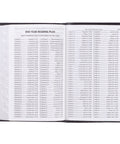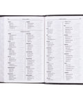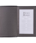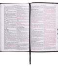 Silver gilt-edged pages, black thumb index tabs, and an attached black satin ribbon page marker adds elegance to an already exquisite design. The standard 9-point type in a double-column format, reader-friendly subheadings, thematic Scripture verse finder, and the words of Christ printed in red will assist you in Bible study. A one-year Bible reading plan is included to keep your reading on track. A presentation page is included to complete with a special encouraging message. The Bible comes packaged in a full-color printed cardboard sleeve.
