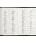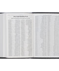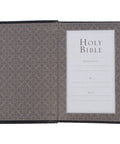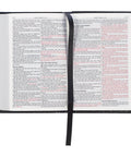 Sophisticated silver gilt-edging on the page edges compliments the silver foil of the title, while an attached black satin ribbon page marker holds your place. A lay-flat flexcover binding allows the Bible to open flat without any damage to the spine.