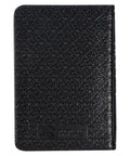 The heat-debossed design connects to a smooth black faux leather front panel with a double topstitched seam. The front panel repeats the title and version reference—only this time in silver foil.