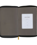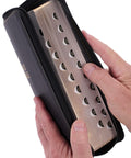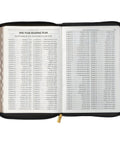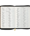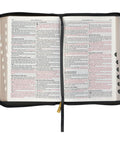 The KJV version reference is heat-debossed on the spine. A sturdy black zipper with a gold zipper pull securely closes the Bible to keep all loose notes and bookmarks safe. Once the Bible is unzipped, you will find gilt-edged pages marked with elegant thumb indexing to locate passages quickly and a black satin ribbon marker to mark them. The text is presented in an easy-to-read 10-point type.
