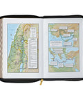 Additional study features include a verse finder, a one-year reading plan, reader-friendly subheadings,8 full-color maps, and Christ’s words printed in red ink. A presentation page is also found at the front.