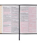 This easy-to-use Bible lays flat when opened and has a large 10-point type arranged in a double-column format. Reader-friendly subheadings and thumb-indexing tabs make locating passages and books of the Bible quick and easy. Inside you’ll find added features such as a thematic Scripture verse finder, 8 full-color maps, and a one-year reading plan, and an attached satin ribbon to mark your place. The words of Christ are printed in red ink.
