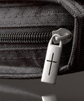 - Silver cross-engraved zipper pull