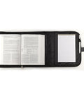 The organizer's interior has three distinct compartments to meet all your study needs. The first compartment is dedicated to housing your Bible and features a zip closure with a silver metal pull, tastefully engraved with a cross motif. The second compartment is an all-in-one hub for your study tools; it's equipped with an ID/photo holder, three slots for credit cards, a pocket that's suitable for either a small cell phone or a selection of pens, a zippered mesh pocket for smaller items, and dual elastic pen loops. Finally, the third compartment is tailored for note-taking, complete with a notepad and highlighter securely held in an additional elastic pen loop.