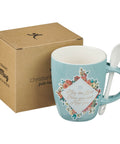 The Bless You and Keep You Teal Ceramic Coffee Mug with Spoon is part of the Bless You and Keep You Collection that includes a wirebound journal, writing paper and envelope set, and a large gift bag.