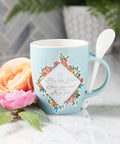 The light teal exterior of the ceramic coffee mug features a white diamond-shaped frame surrounded by bright pastel-colored blossoms. The frame holds the sentiment, taken from the well-known Old Testament priestly blessing, presented in an informal silver-foiled script.