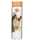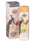 The Blessed Blue Peacock Glass Water Bottle is part of the Blessed Blue Peacock Secret Garden Collection that includes a ceramic mug, a stainless steel travel mug, a faux leather Bible cover, a hardcover journal, a faux leather journal, a glass water bottle, a reusable tote bag, a notebook set, and a gift bag.