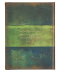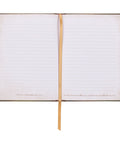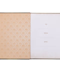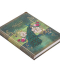 The pearlescent cover of the journal, with its subtle sheen, exudes an enchanting charm. It is adorned with a stunning blue peacock set against a lush green backdrop. Delicate pink flowers and intricate golden swirls gracefully surround the peacock, hiding an antique key and evoking a sense of beauty, mystery, and wonder. Enhancing the elegance of the design, a lacy frame in antique gold borders the edges of the journal, flawlessly complementing the sentiment expressed in gold-foiled letters.