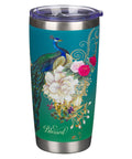 The Blessed Blue Peacock Stainless Steel Travel Tumbler is part of the Blessed Blue Peacock Secret Garden Collection that includes a ceramic mug, a stainless steel travel mug, a faux leather Bible cover, a hardcover journal, a faux leather journal, a glass water bottle, a reusable tote bag, a notebook set, and a gift bag.
