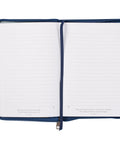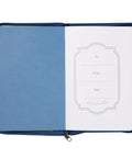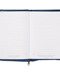 A gold zipper pull, elegantly placed atop a blue zipper, securely closes the contents of the journal, ensuring that the cherished words and memories are kept safe. The interior pages feature lined paper, providing a structured canvas for writing, while each page is adorned with a carefully chosen Scripture verse, offering moments of meditation and memorization. With 366 pages and a convenient ribbon marker, you can easily mark your progress and return to your thoughts with ease.