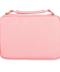 This cute and lovely combo pink and ivory Blessed Pink Scalloped Faux Leather Fashion Bible Cover makes a sweet gift for the uber-trendy girl who wants to carry her Bible in style. The sides and back of the Bible cover are made of pink faux leather while the front panel is constructed of a soft ivory white panel, overlayed with a super cute scalloped pink panel. The pink scalloped panel creates a useful slip pocket. Bright gold metal letters, set against the white front panel, spell out the word