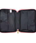 The faux leather carry handle is secured with coordinating gold hardware and a gold zipper pull is engraved with the word