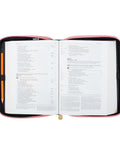 Inside the pink scalloped cover, you will find two pockets to securely hold your Bible's front and back covers and two pen loops. This Bible cover is available in two sizes: medium and large. Please refer to the last image in the image carousel on the left for the Bible Cover Sizing Chart before you make a selection.
